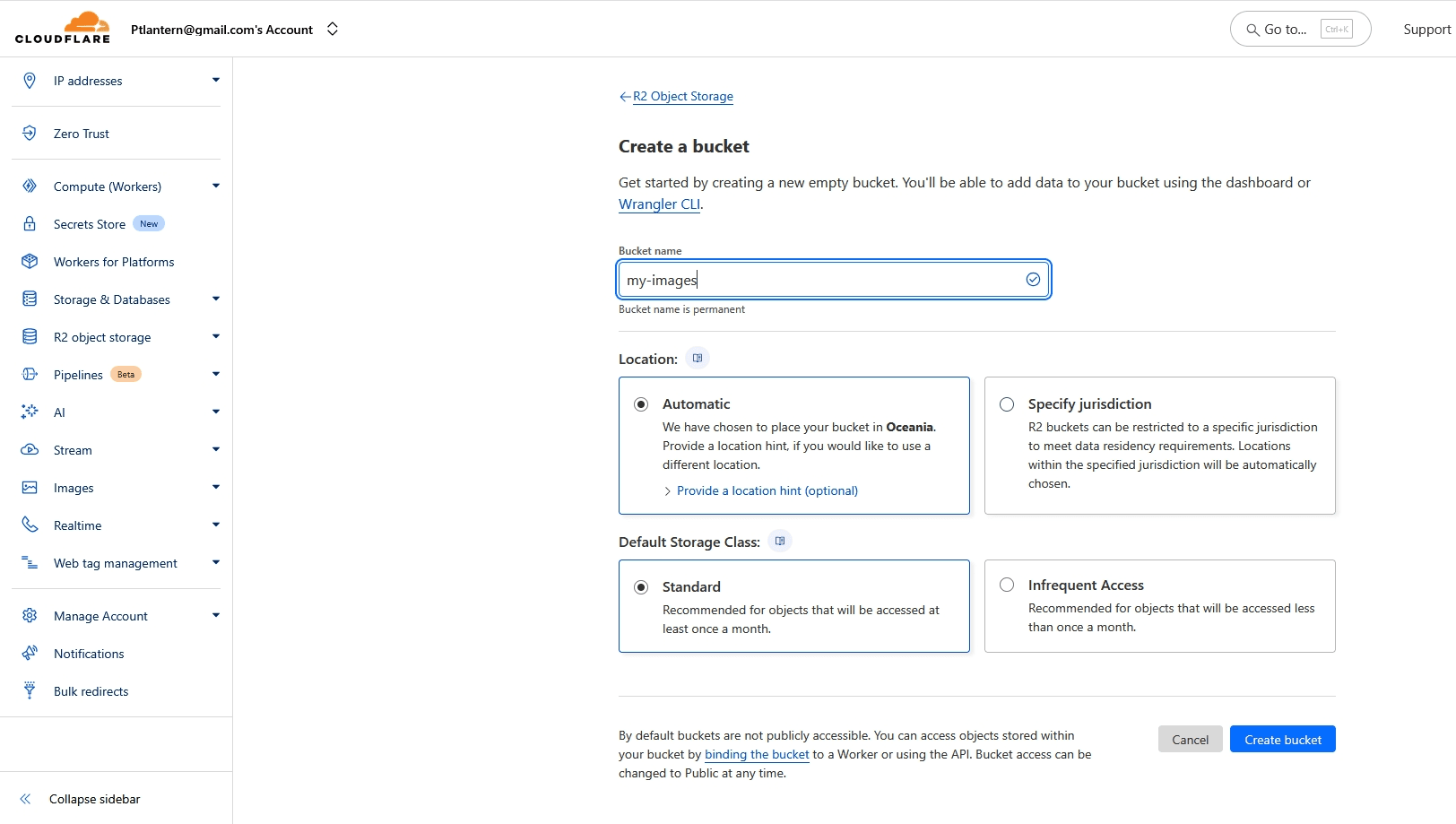 - Bucket name: 输入一个全局唯一的存储桶名称 (例如
